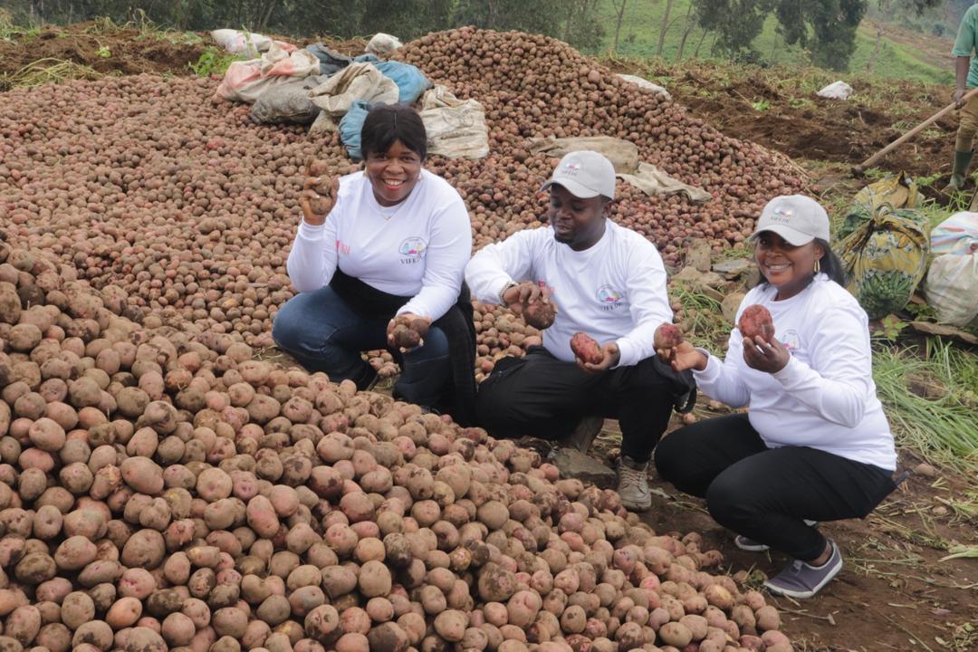 sur image trois agents de la VIFEDE, dont la coordinatrice de la vifede à Karuba, lors de la récolte des pommes de terre effectuée par l’un des agro-multiplicateurs accompagnés par le projet. photo VIFEDE © Ange kahemulo